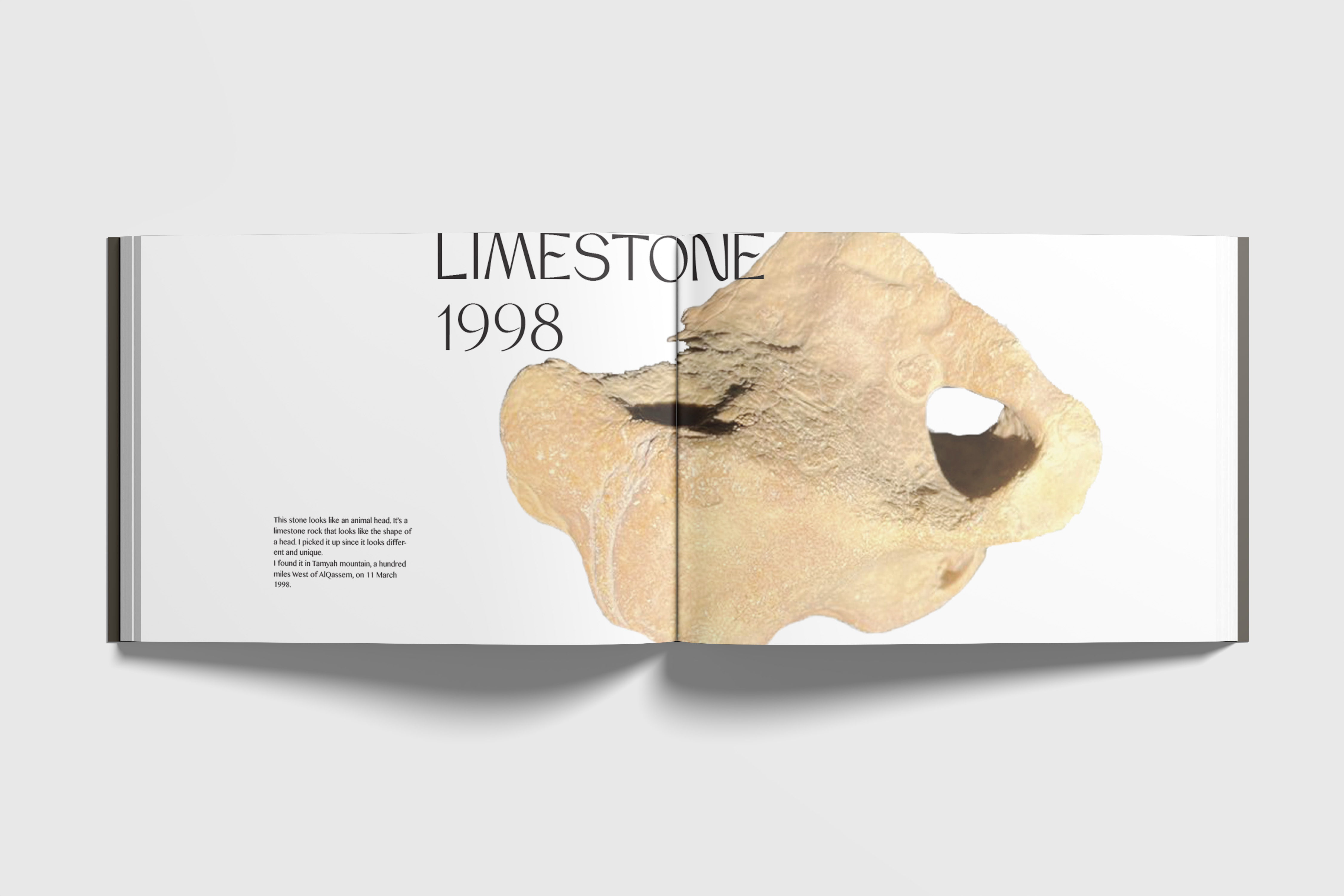 Hajar is a book I designed for my father, who has had a lifelong passion for collecting rocks. Since he was young, he’s been fascinated by the textures, colors, and stories that each stone carries. Over the years, he not only collected rocks but gave each one a unique name and carefully recorded his thoughts and notes about them.